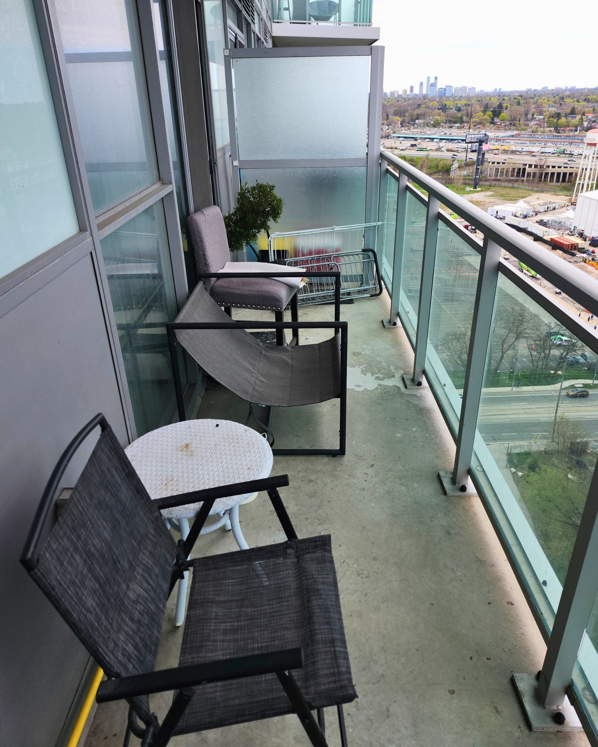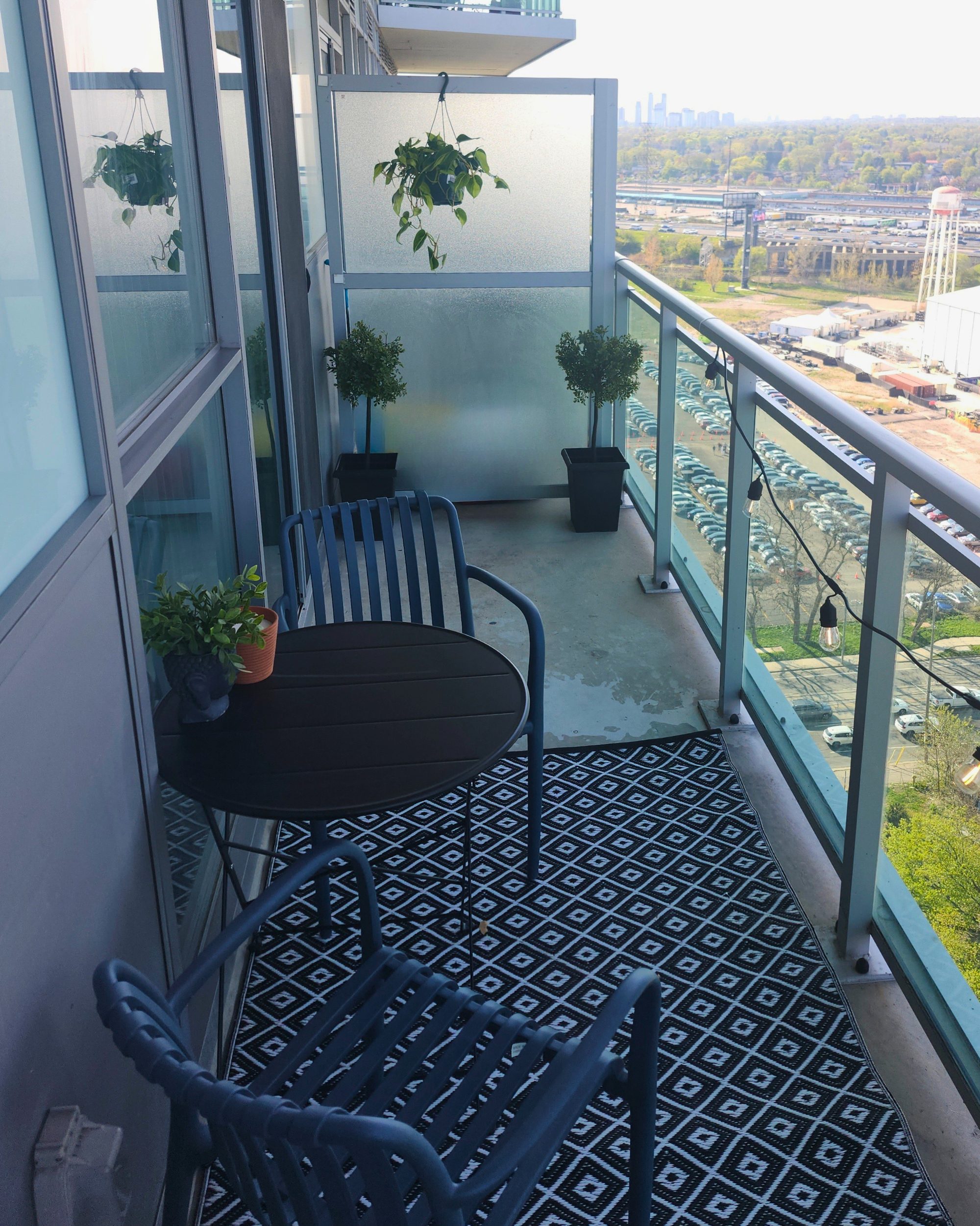 New furniture better suited to the space, paired with simple styling and warm string lighting to soften this masculine condo balcony.